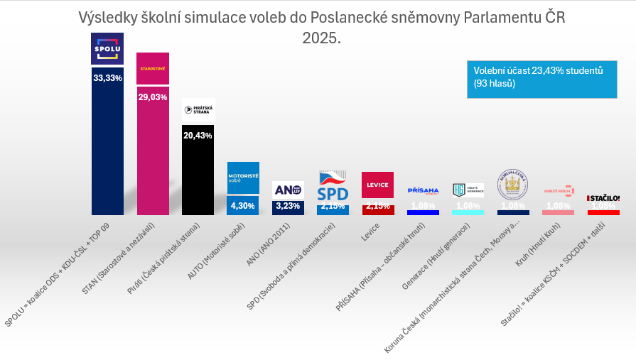 V týdnu od 30. září do 2. října 2025 proběhla na naší škole úspěšná simulace voleb do Poslanecké sněmovny České republiky. V rámci výuky občanského vzdělávání si tak všichni studenti mohli vyzkoušet celý volební proces a odevzdat svůj hlas v digitálním prostředí.